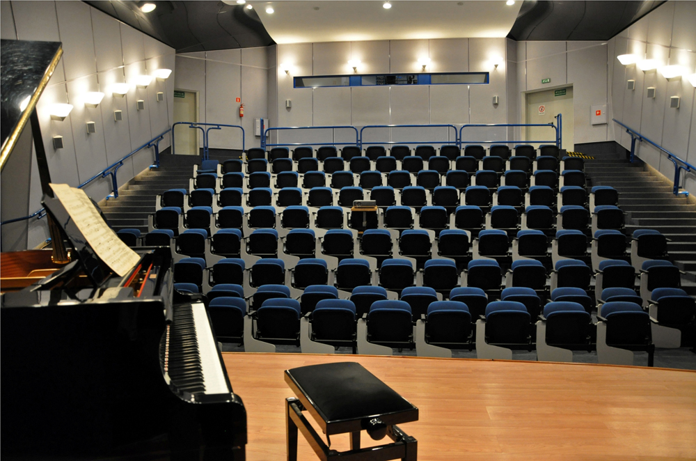 SALA AUDYTORYJNA PARNASSOS – nowoczesna, z widownią w formie kinowej, znajduje się w holu głównym biblioteki.