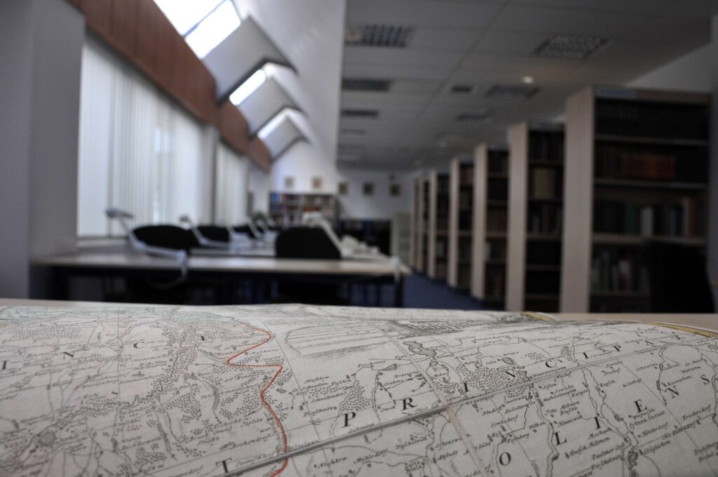 Lesesaal der Sondersammlungen - eine Nahaufnahme der Karte im Vordergrund, Leserstationen im Hintergrund.