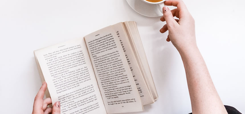 An open book lying on the table, held in the left hand. The right hand reaches for a cup of tea.